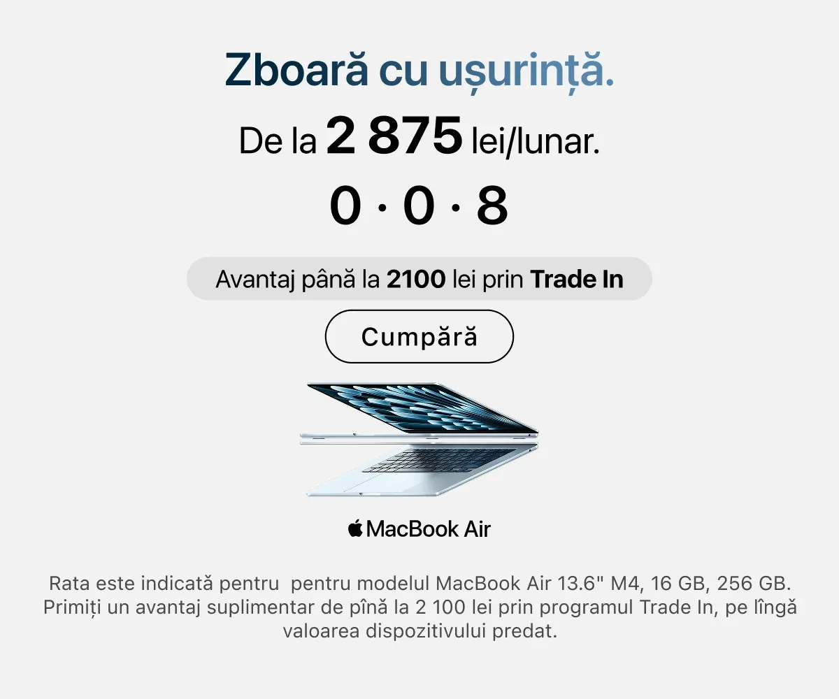 Experții noștri sunt întotdeauna gata să vă ajute în alegerea modelului potrivit. De asemenea, vă pot sprijini în personalizarea dispozitivului și oferă instruire practică. Chiar în magazin puteți beneficia de ajutor pentru crearea unui Apple ID, transferul fișierelor de pe dispozitivul anterior, aplicarea foliei de protecție, actualizarea sistemului de operare sau conectarea mai multor echipamente într-un singur ecosistem.