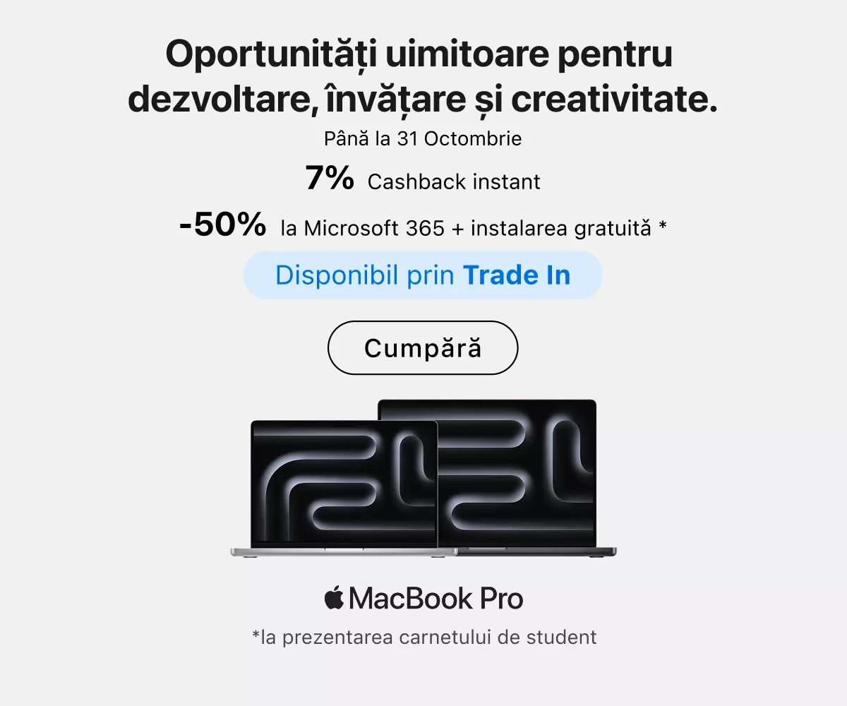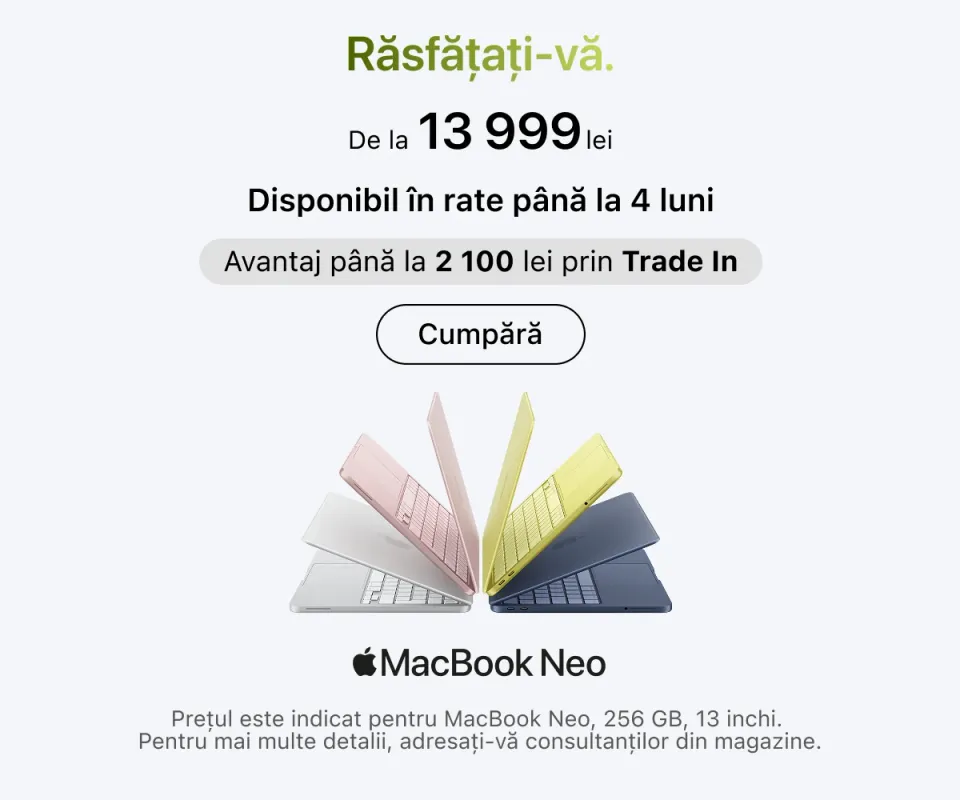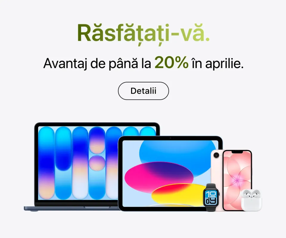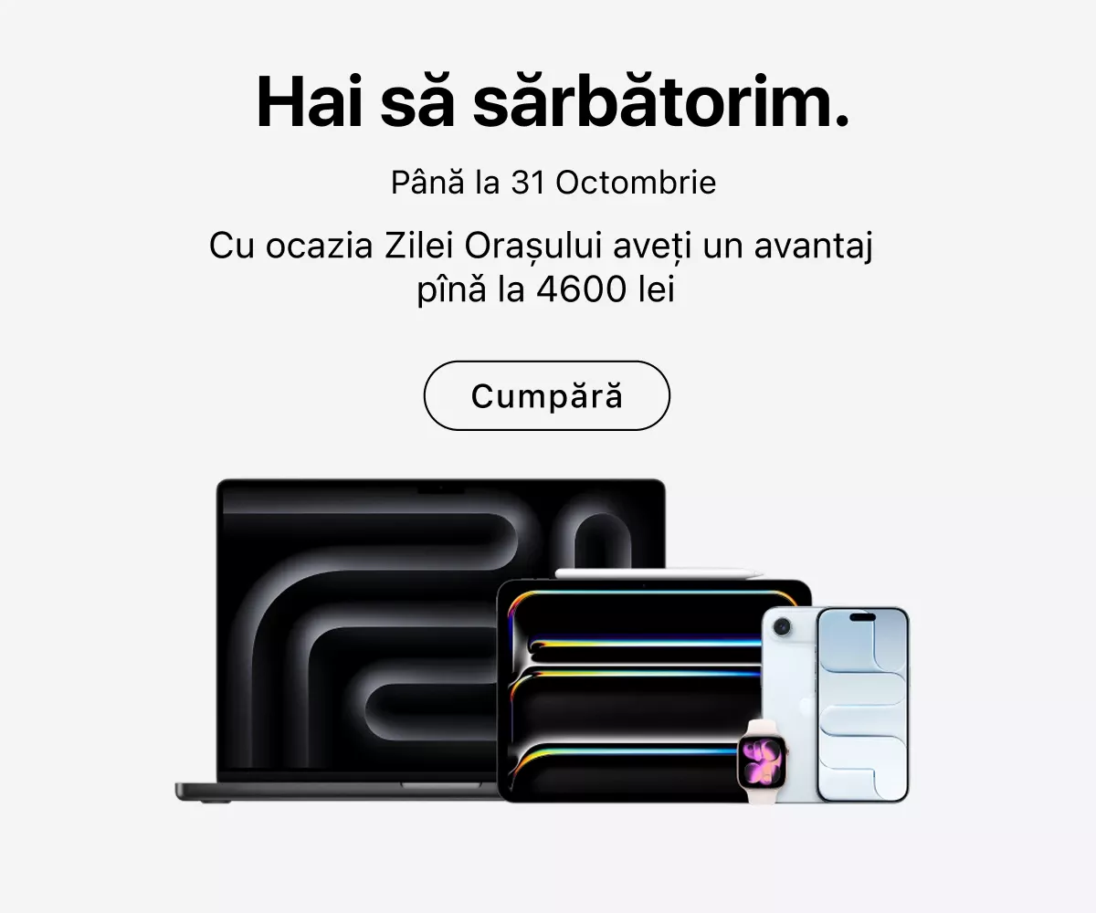 Experții noștri sunt întotdeauna gata să vă ajute în alegerea modelului potrivit. De asemenea, vă pot sprijini în personalizarea dispozitivului și oferă instruire practică. Chiar în magazin puteți beneficia de ajutor pentru crearea unui Apple ID, transferul fișierelor de pe dispozitivul anterior, aplicarea foliei de protecție, actualizarea sistemului de operare sau conectarea mai multor echipamente într-un singur ecosistem.