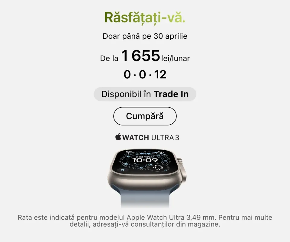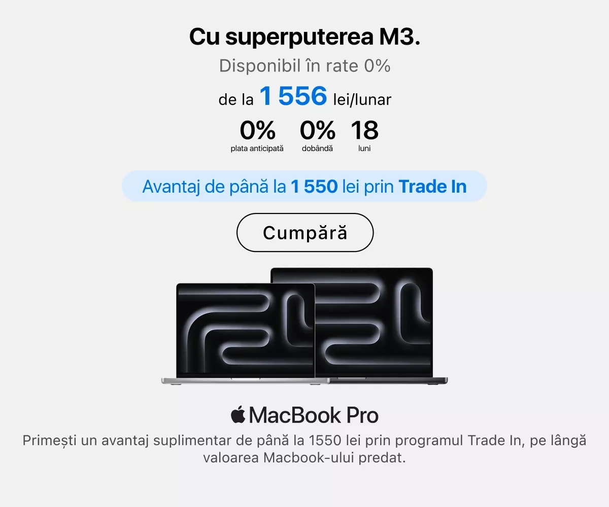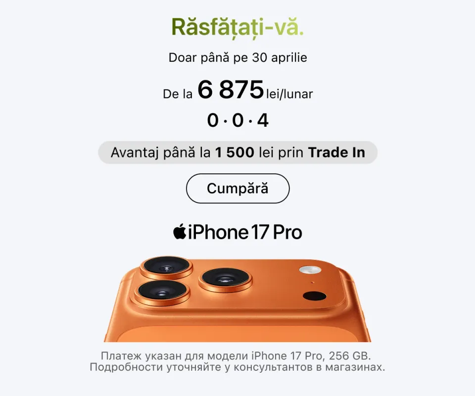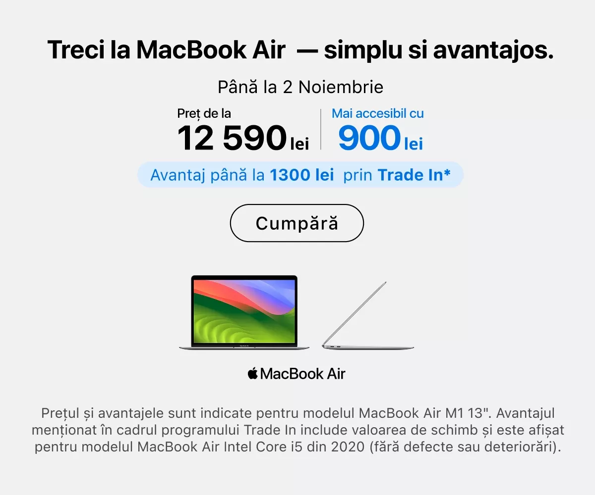 Experții noștri sunt întotdeauna gata să vă ajute în alegerea modelului potrivit. De asemenea, vă pot sprijini în personalizarea dispozitivului și oferă instruire practică. Chiar în magazin puteți beneficia de ajutor pentru crearea unui Apple ID, transferul fișierelor de pe dispozitivul anterior, aplicarea foliei de protecție, actualizarea sistemului de operare sau conectarea mai multor echipamente într-un singur ecosistem.