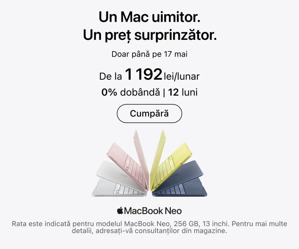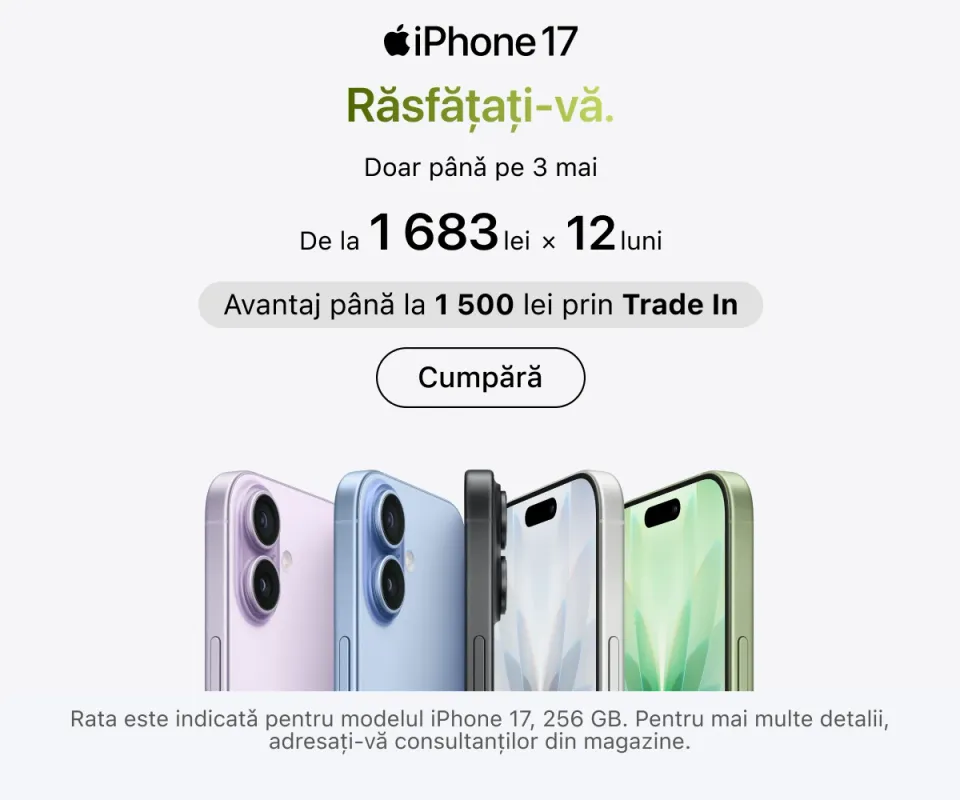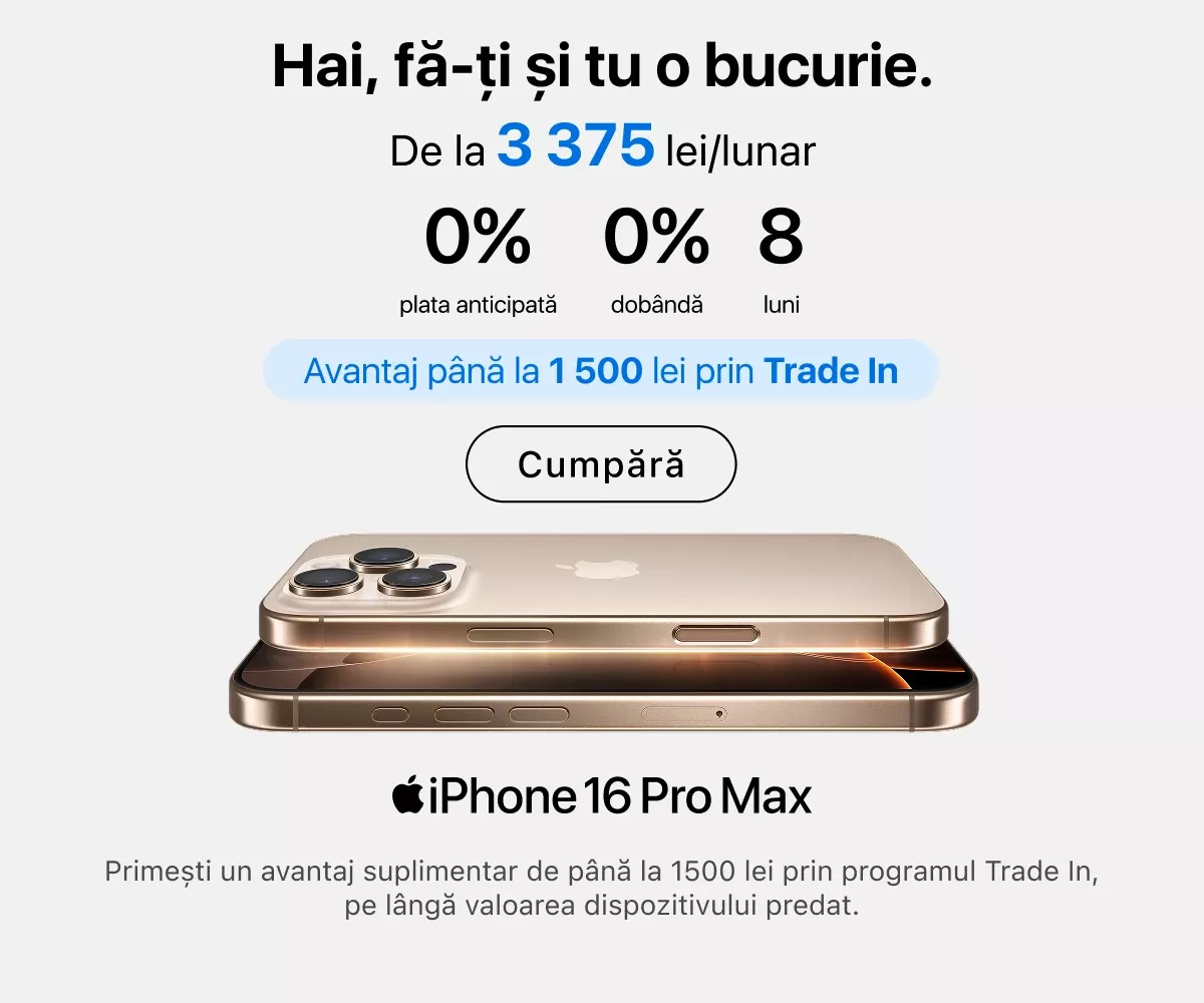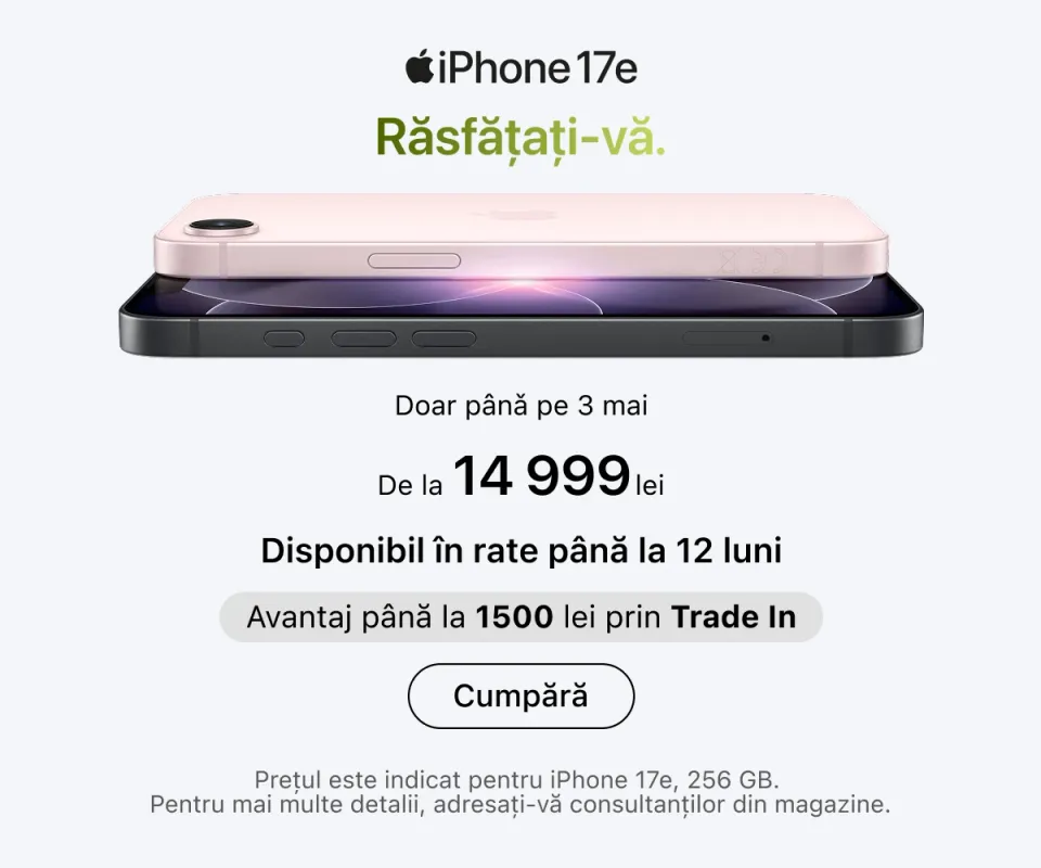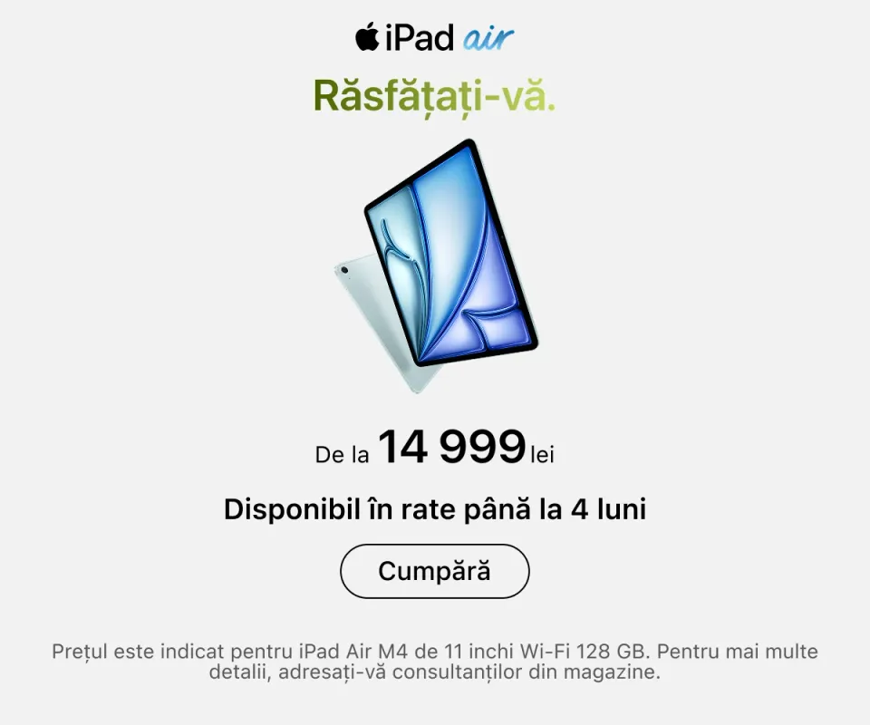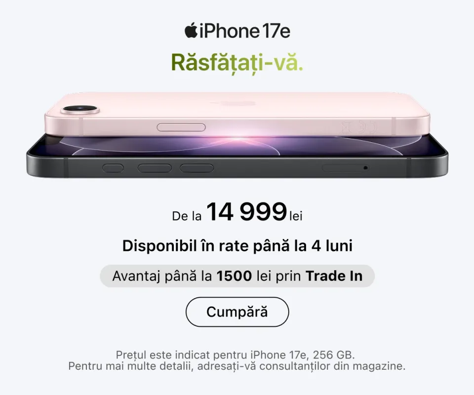 Cele mai recente serii de iPhone se află deja în vânzare. Puteți alege capacitatea de memorie dorită, culoarea preferată și puteți adăuga imediat accesorii originale. iPad-urile sunt ideale pentru muncă și creativitate: toate modelele sunt compatibile cu Apple Pencil și tastaturi, transformând tableta într-un instrument versatil pentru desen, notițe sau redactare.