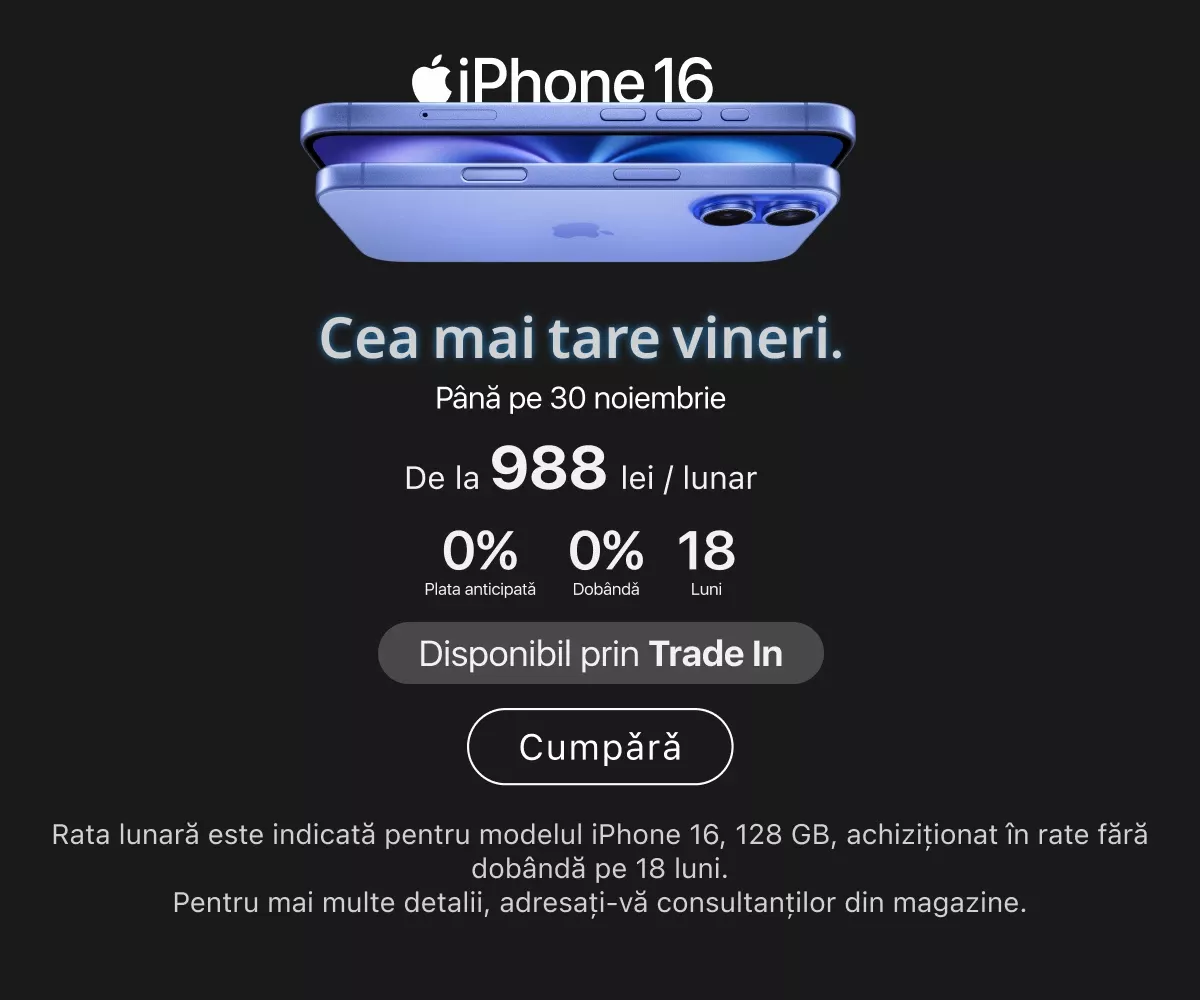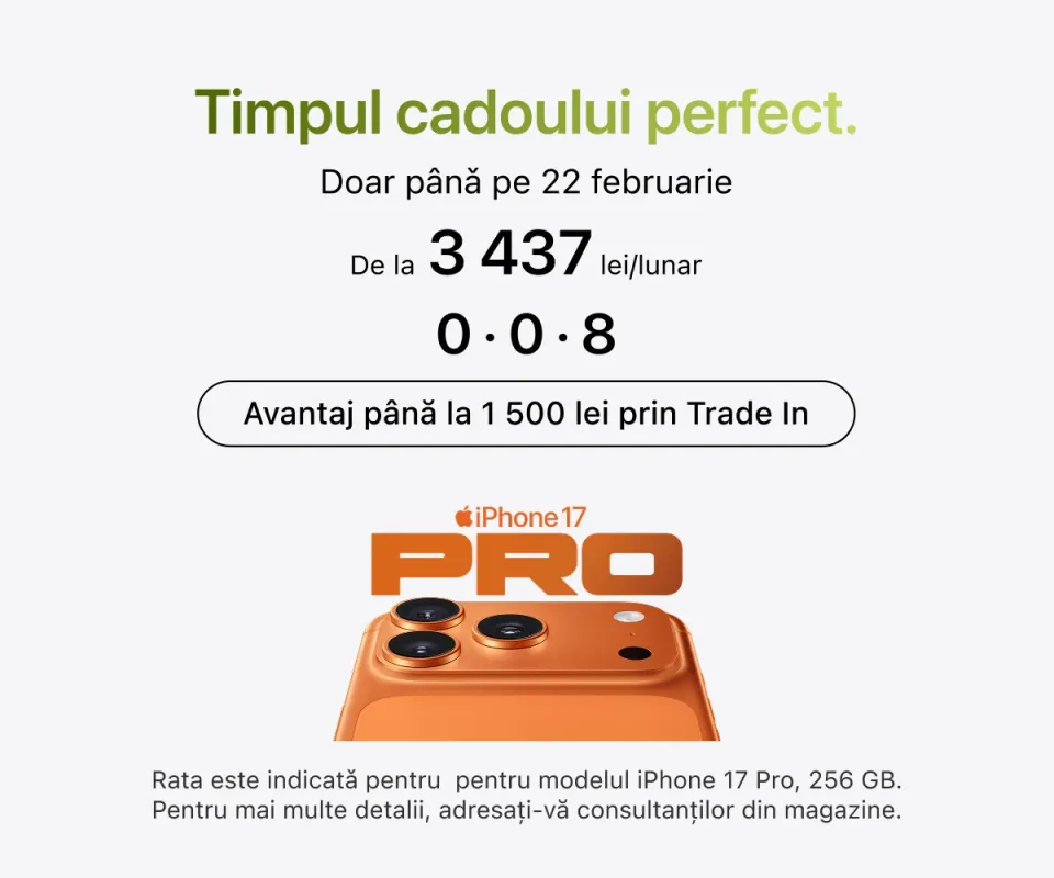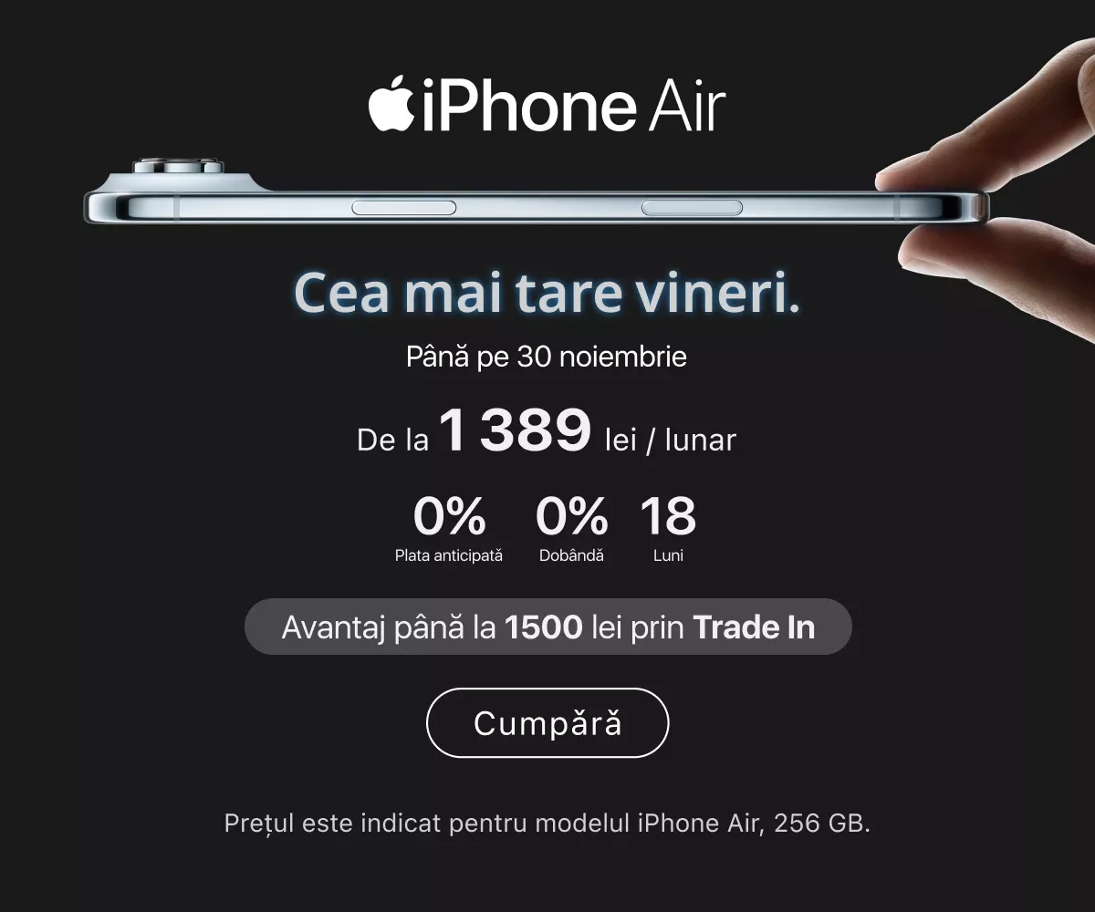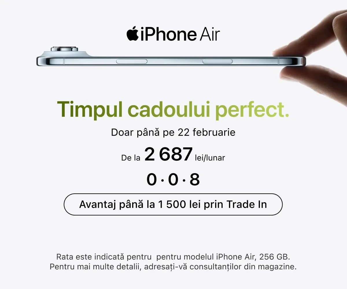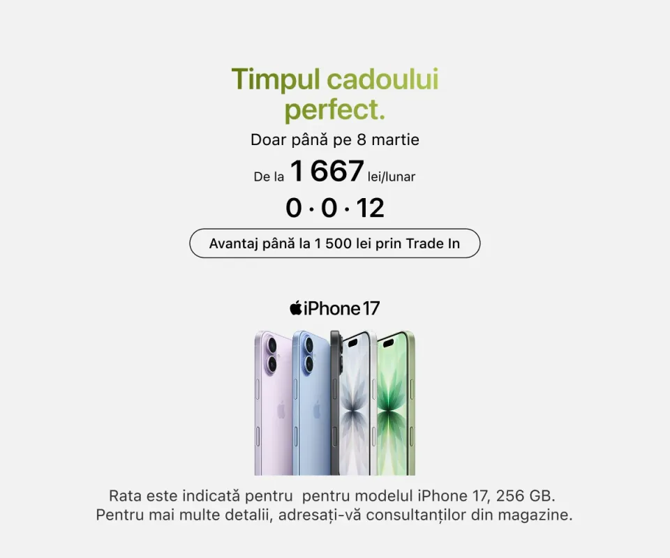 Cele mai recente serii de iPhone se află deja în vânzare. Puteți alege capacitatea de memorie dorită, culoarea preferată și puteți adăuga imediat accesorii originale. iPad-urile sunt ideale pentru muncă și creativitate: toate modelele sunt compatibile cu Apple Pencil și tastaturi, transformând tableta într-un instrument versatil pentru desen, notițe sau redactare.