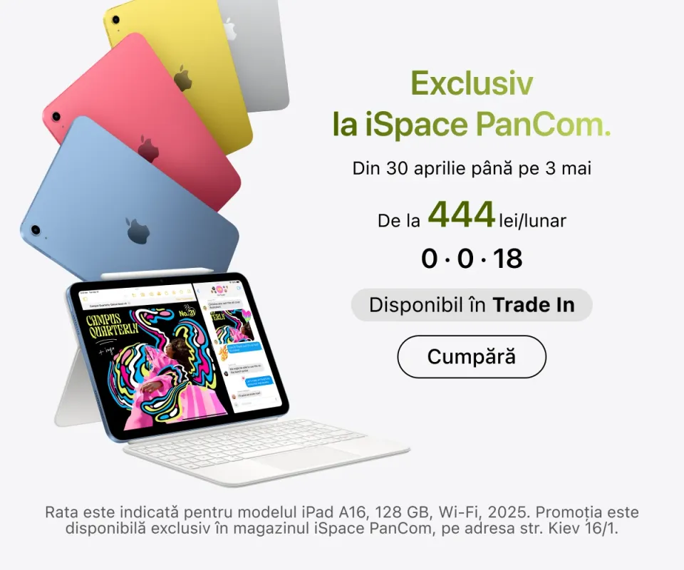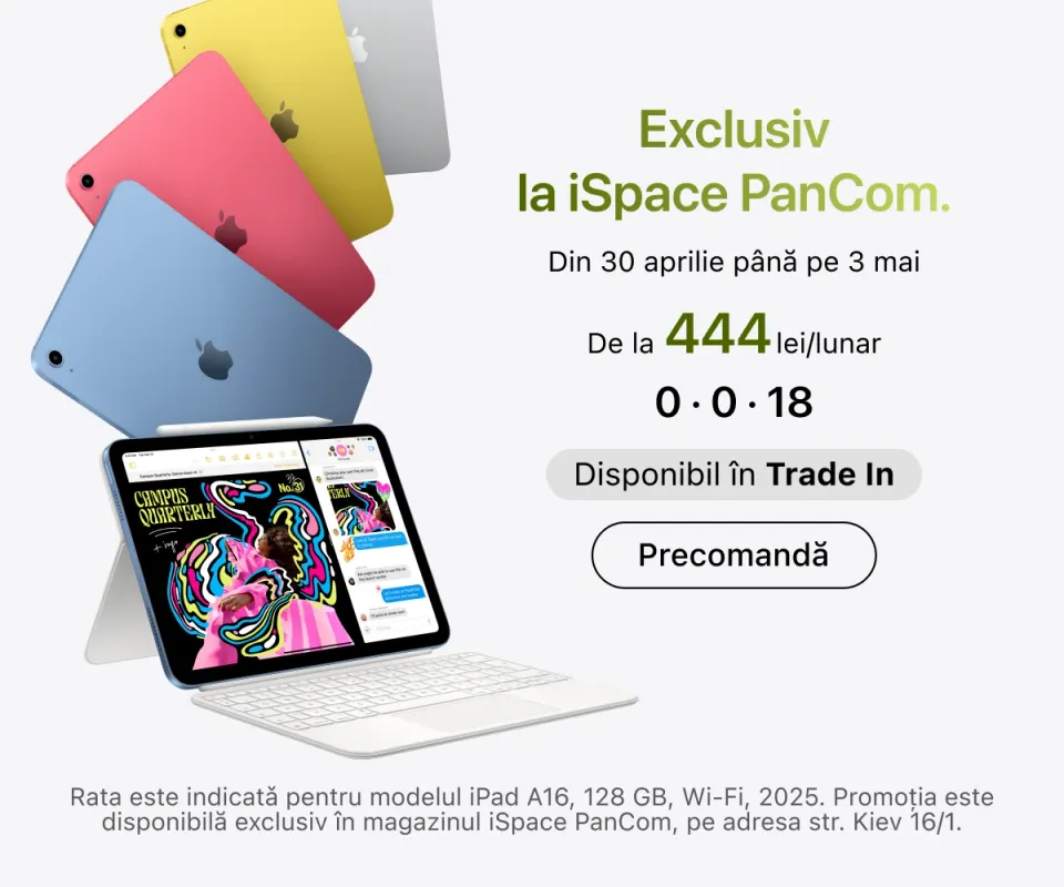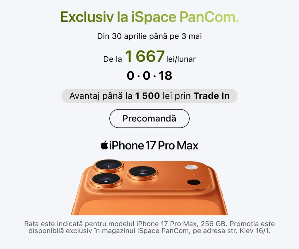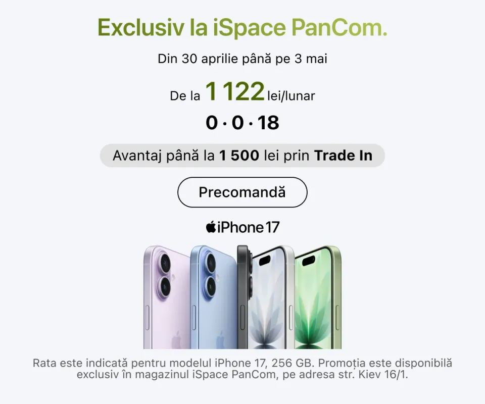 iSpace este locul unde tehnologia întâlnește grija pentru utilizator. Puteți plasa comenzi online sau offline, consulta experții noștri și solicita ajutor pentru configurare. Achiziționați primul gadget de aici, înscrieți-vă în programul de loialitate și bucurați-vă la maximum de experiența Apple.