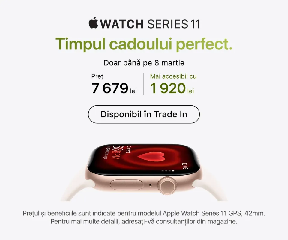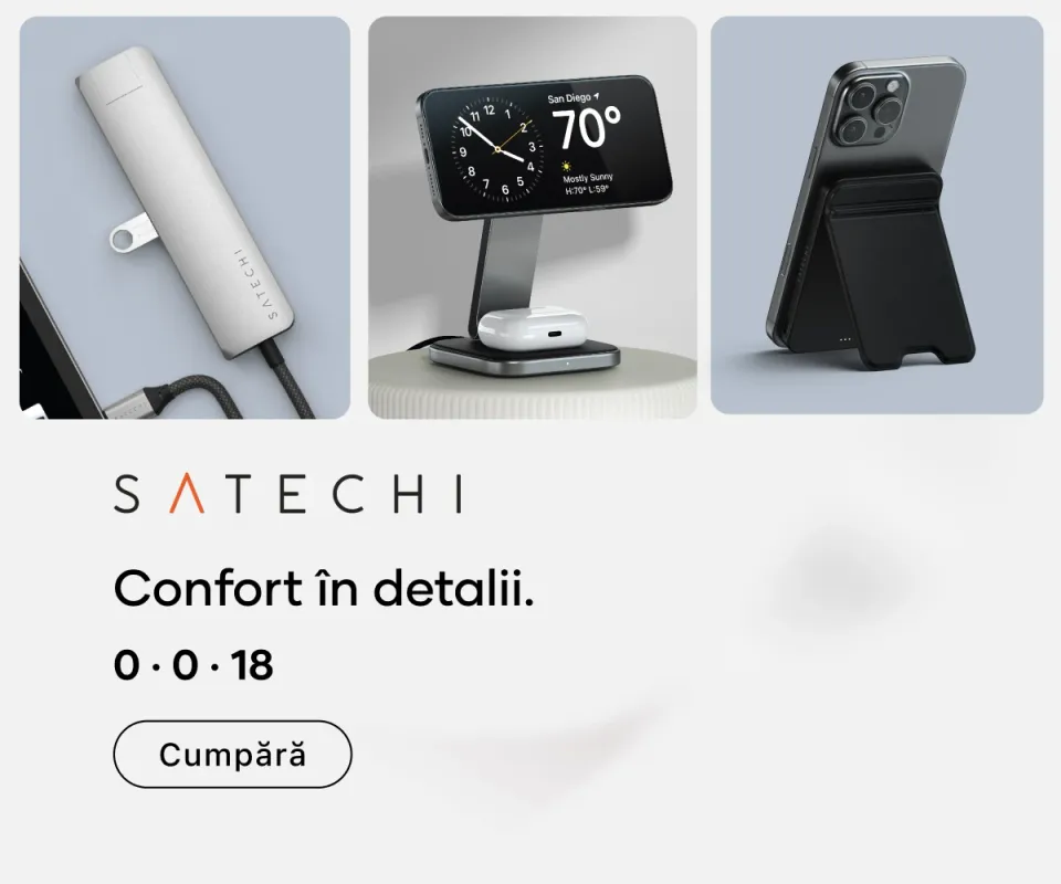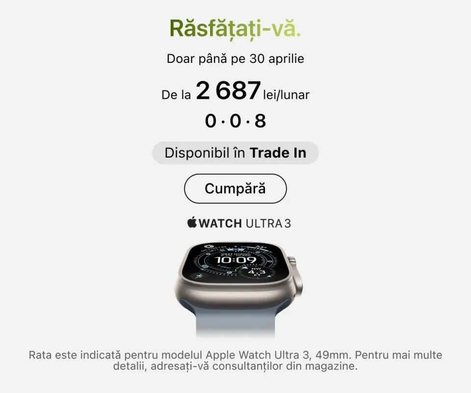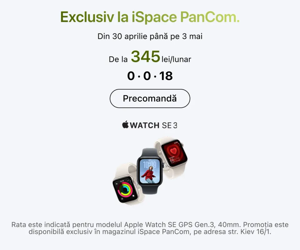 Apple Watch poate fi achiziționat în diverse versiuni. Ceasul permite preluarea apelurilor și notificărilor, controlează muzica, oferă funcții de navigare și monitorizează indicatorii de sănătate. Ecosistemul este completat de căștile AirPods, care se sincronizează rapid cu dispozitivele Apple și comută ușor între ele. În iSpace găsiți și o gamă variată de accesorii – de la huse pentru telefoane la tastaturi pentru tablete.