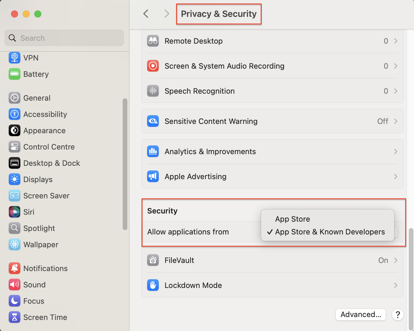 - în secțiunea „Securitate”, activați opțiunea „App Store și de la dezvoltatori de încredere”.