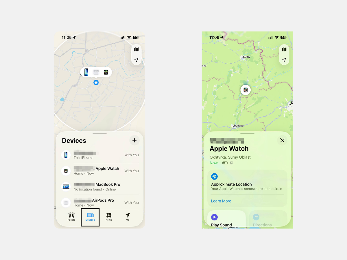 Dacă dispozitivul se află în afara locuinței sau bateria este descărcată, puteți urma o altă metodă. Aplicația „Găsire” va afișa ultima poziție cunoscută a ceasului. Deschideți aplicația, accesați fila „Dispozitive” și selectați Apple Watch-ul – acesta va fi afișat pe hartă.
