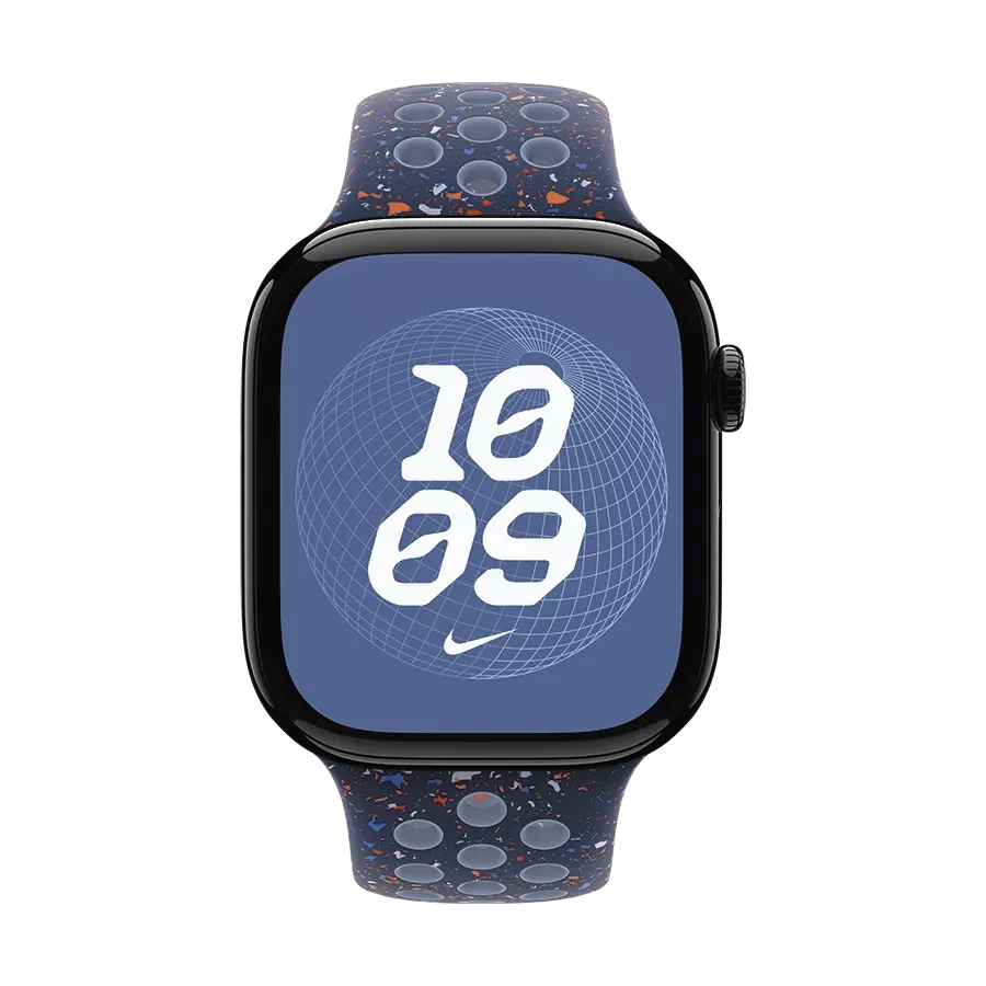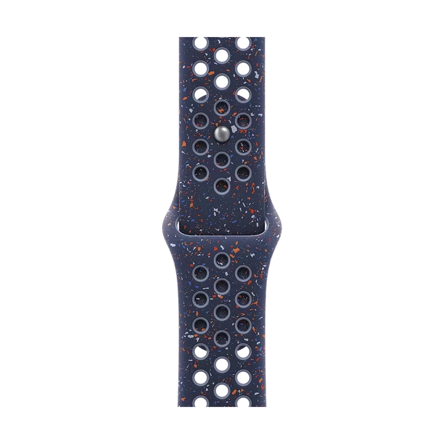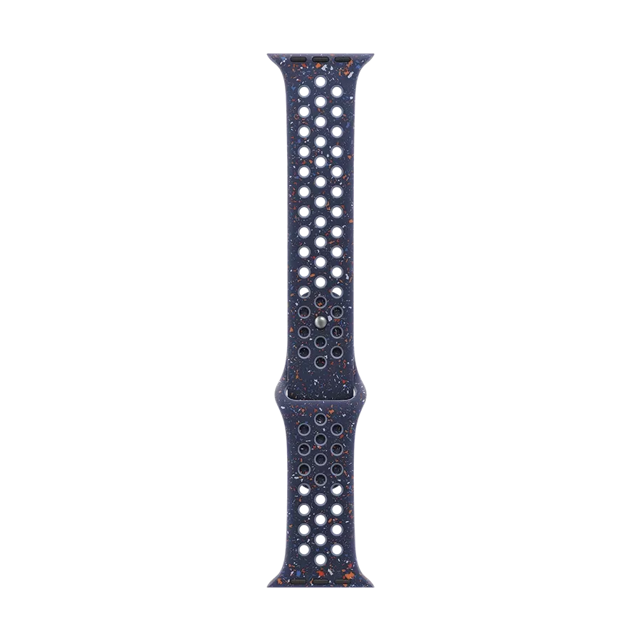 Fabricată cu perforații obținute prin compresie pentru îmbunătățirea ventilației, cureaua Nike Sport este rezistentă, puternică și surprinzător de moale. Are fulgi colorați care creează un model aleatoriu, ceea ce face ca fiecare curea să fie complet unică. Materialul neted și compact se înfășoară elegant pe încheietura mâinii și se simte confortabil pe piele. Sistemul nou de închidere tip capsă din aluminiu conferă închizătorii un aspect nou, mat. Această curea conține cel puțin 30% fluoroelastomer reciclat, iar fiecare fulg conține cel puțin 66% fluoroelastomer reciclat.